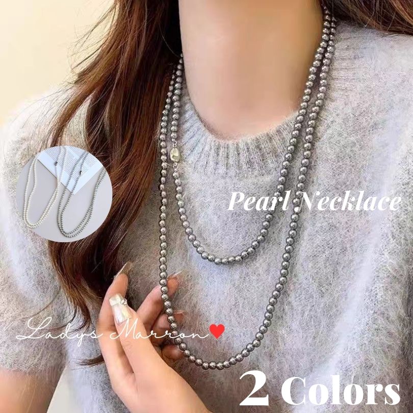 グレーパールネックレス シルバーパールネックレス カジュアル 2連パールネックレス ロングパールネッ・・・