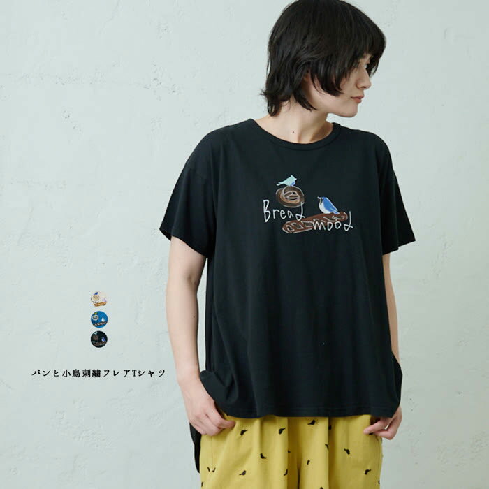 パンと小鳥刺繍フレアTシャツ emago ナチュラル カジュアル 大人 かわいい 北欧