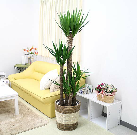 ユッカ(青年の木)10号鉢+ホワイトバスケット鉢カバー 土の表面:ウッドチップ|観葉植物 ブルーミン・・・