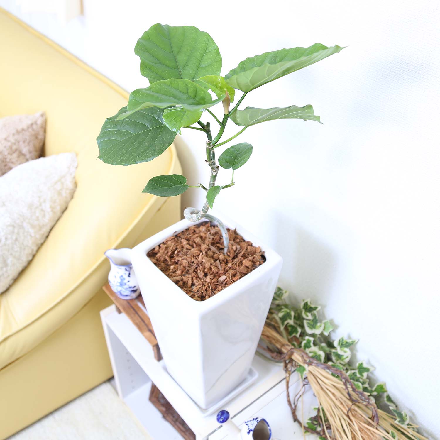 スパイラル仕立てのウンベラータ 7号 ホワイトスクエア陶器鉢 ストレート+陶器製お皿付き 土の表面:・・・