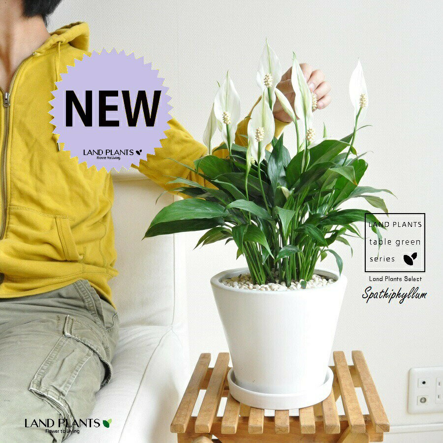 スパティフィラム(白花) 白色 ラウンド 陶器鉢 Mサイズ 【黄色小石・受皿】白 ホワイト 白の美し・・・