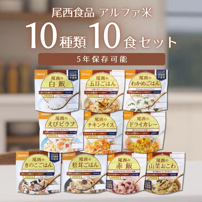【5年保存】尾西のアルファ米 10種類詰合せ×各1袋|非常食・保存食・防災備蓄に!