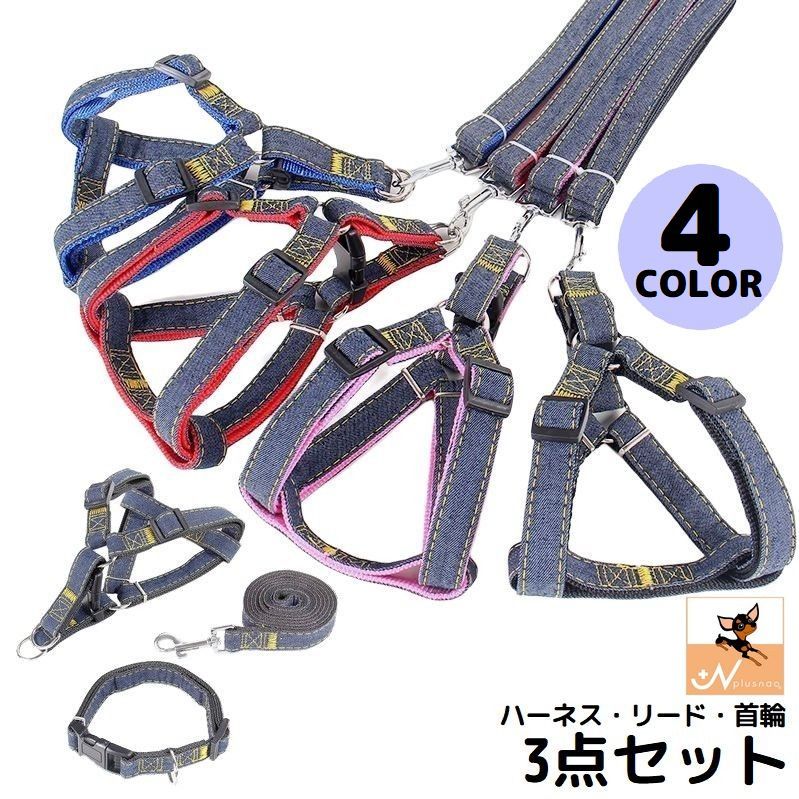 送料無料 ハーネス リード 首輪 3点セット ペット用品 小型犬 中型犬 猫 デニム 胴輪 胸あて ・・・