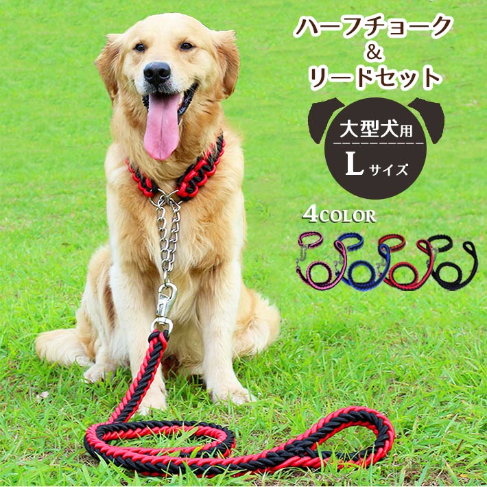 大型犬 首輪 ハーフチョーク (リード付き)【全4色】Lサイズ 丈夫な編み紐・チェーンタイプ